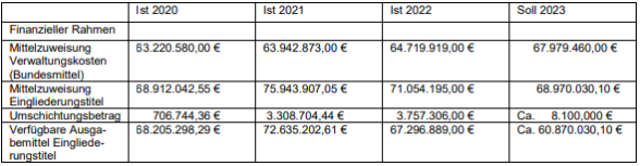 Bei der zu erwartenden Mittelzuteilung für das laufende Jahr 2023 (Soll 2023) ist bei der Schätzung der Verwaltungskosten bereits ein zusätzlicher Aufschlag aus Bundesmitteln i.H.v. 2,167 Mio. € berücksichtigt worden, welcher u.a. zur Deckung der Kosten infolge der Tarif- und Besoldungsbeschlüsse 2023 vorgesehen sein soll und ggf. Ende August/Anfang September zugeteilt werden soll.