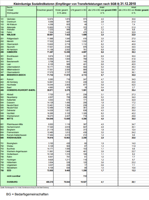 In Bezug auf die Gesamtkinderanzahl in SGB II Bezug entspricht der Anteil der nicht-deutschen Kinder und Jugendlichen somit 46,1%. Die Anzahl aller Kinder und Jugendlichen in SGB II Bezug entspricht einem Anteil von 4,7 % der gesamtstädtischen Bevölkerung. Zum 31.12.2016 waren 502.634 Personen in Duisburg gemeldet, hiervon waren 74.830 im Alter von 0 bis einschließlich 15 Jahren. Gesamtstädtisch befanden sich 21.191 Kinder und Jugendliche der Altersgruppe im SGB II Bezug, davon waren 7.885 ohne deutsche Staatsbürgerschaft. In Bezug auf die Gesamtkinderanzahl in SGB II Bezug entspricht der Anteil der nicht-deutschen Kinder und Jugendlichen somit 37,2 %. Die Anzahl aller Kinder und Jugendlichen in SGB II Bezug entspricht einem Anteil von 4,2 % der gesamtstädtischen Bevölkerung. Zum 31.12.2010 waren 488.218 Personen in Duisburg gemeldet, hiervon waren 70.844 im Alter von 0 bis einschließlich 15 Jahren. Gesamtstädtisch befanden sich 19.927 Kinder und Jugendliche der Altersgruppe im SGB II Bezug, eine Differenzierung nach Staatsbürgerschaft ist nicht möglich. Die Anzahl aller Kinder und Jugendlichen in SGB II Bezug entspricht einem Anteil von 4,1 % der gesamtstädtischen Bevölkerung. Eine detaillierte Darstellung auf Ortsteilebene findet sich anschließend.