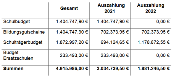 das Budget der Ersatzschulen im Haushaltsjahr 2021 zur Auszahlung gebracht.