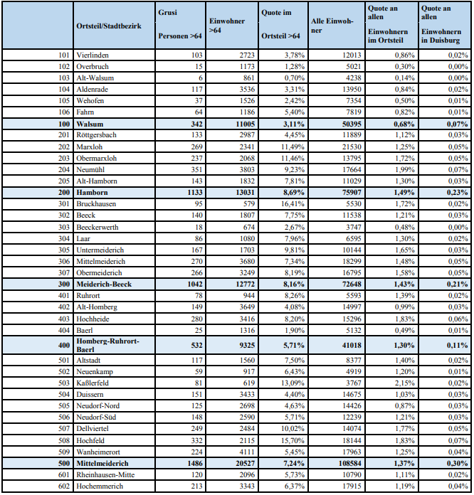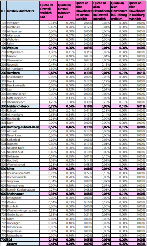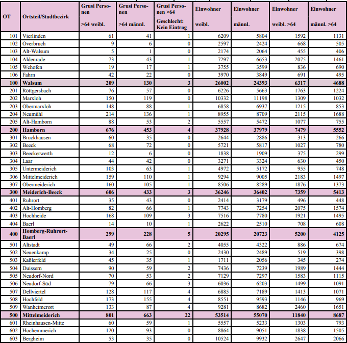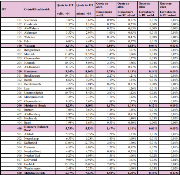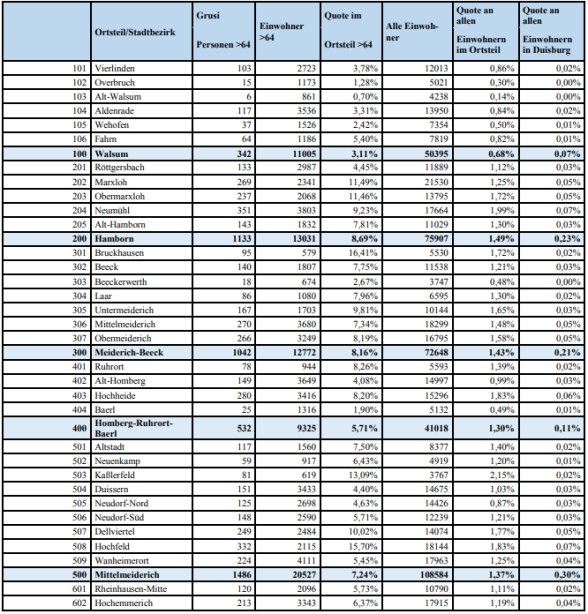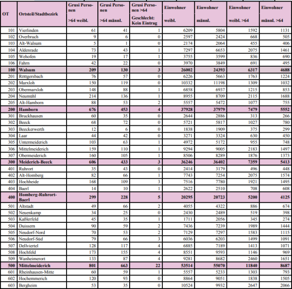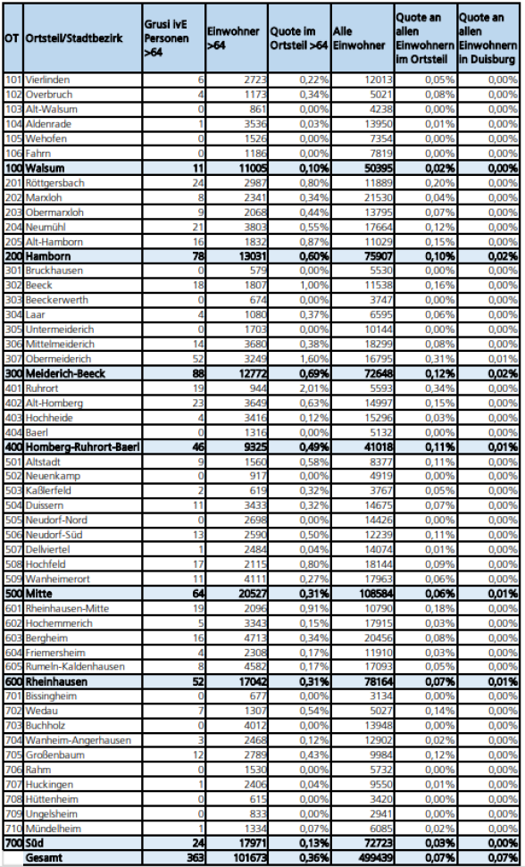 Die abgefragten Daten beziehen sich auf den Stichtag 31.12.2021. Differenzierte Abfragen dieser Art sind technisch für die Vorjahre nicht möglich, so dass hier auf die Daten der genannten DS 19-1311 verwiesen wird. Bei den abgefragten Daten unter „Personen mit Grundsicherung“ handelt es sich um den Personenkreis mit Bezug von Leistungen der Grundsicherung nach SGB XII (4. Kap.) außerhalb von Einrichtungen ab 65 Jahren in den einzelnen Ortsteilen und dem jeweiligen Stadtbezirk. Die Spalte „Quote im Ortsteil“ misst sich an den Leistungsberechtigten und der Einwohnerzahl über 65 Jahre im jeweiligen Ortsteil und die Spalte „Quote an allen Einwohnern“ misst sich an den Leistungsberechtigten und der Gesamteinwohnerzahl im jeweiligen Ortsteil. Die Spalte „Quote im Ortsteil weiblich“ sowie die Spalte „Quote im Ortsteil männlich“ misst sich an den Leistungsberechtigten und der Einwohnerzahl über 65 Jahre im jeweiligen Ortsteil und die Spalte „Quote an allen Einwohnern“ misst sich an den Leistungsberechtigten und der Gesamteinwohnerzahl im jeweiligen Ortsteil. Die Spalte „Quote im Ortsteil deutsche Nationalität“, sowie die „Quote im Ortsteil keine deutsche Nationalität“ misst sich an den Leistungsberechtigten und der Einwohnerzahl über 65 Jahre im jeweiligen Ortsteil und die Spalte „Quote an allen Einwohnern“ misst sich an den Leistungsberechtigten und der Gesamteinwohnerzahl im jeweiligen Ortsteil. Im Jahr 2021 erhielten somit 5.530 Personen Leistungen der Grundsicherung nach SGB XII (4. Kap.) außerhalb von Einrichtungen ab 65 Jahren in Duisburg. Davon waren 3.167 Personen weiblichen Geschlechts und 2.318 Personen männlichen Geschlechts, bei 45 Personen wurde kein Geschlecht angegeben. 3.681 Personen waren deutscher Nationalität und 1.849 Personen nichtdeutscher Nationalität