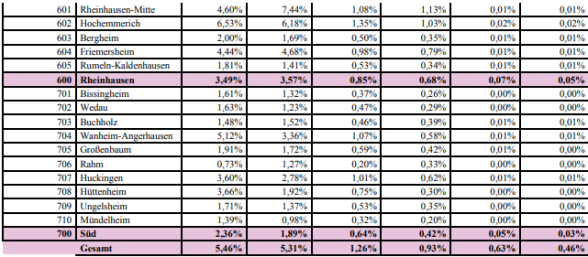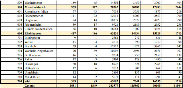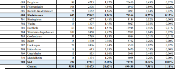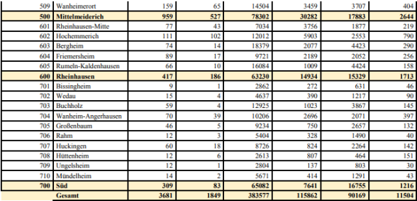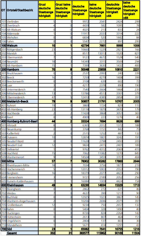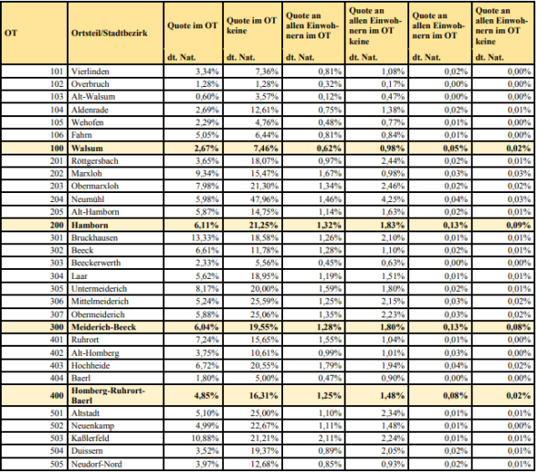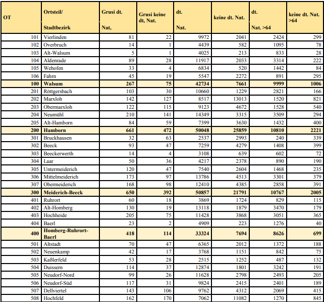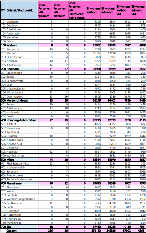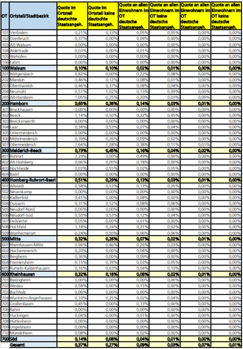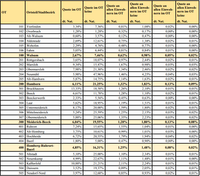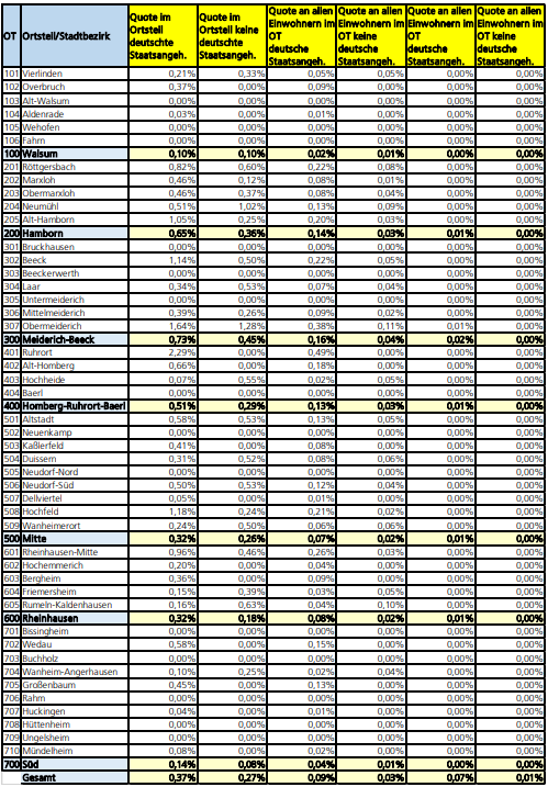 Die abgefragten Daten beziehen sich auf den Stichtag 31.12.2021. Differenzierte Abfragen dieser Art sind technisch für die Vorjahre nicht möglich, so dass hier auf die Daten der genannten DS 19-1311 verwiesen wird. Bei den abgefragten Daten unter „Personen mit Grundsicherung“ handelt es sich um den Personenkreis mit Bezug von Leistungen der Grundsicherung nach SGB XII (4. Kap.) außerhalb von Einrichtungen ab 65 Jahren in den einzelnen Ortsteilen und dem jeweiligen Stadtbezirk. Die Spalte „Quote im Ortsteil“ misst sich an den Leistungsberechtigten und der Einwohnerzahl über 65 Jahre im jeweiligen Ortsteil und die Spalte „Quote an allen Einwohnern“ misst sich an den Leistungsberechtigten und der Gesamteinwohnerzahl im jeweiligen Ortsteil. Die Spalte „Quote im Ortsteil weiblich“ sowie die Spalte „Quote im Ortsteil männlich“ misst sich an den Leistungsberechtigten und der Einwohnerzahl über 65 Jahre im jeweiligen Ortsteil und die Spalte „Quote an allen Einwohnern“ misst sich an den Leistungsberechtigten und der Gesamteinwohnerzahl im jeweiligen Ortsteil. Die Spalte „Quote im Ortsteil deutsche Nationalität“, sowie die „Quote im Ortsteil keine deutsche Nationalität“ misst sich an den Leistungsberechtigten und der Einwohnerzahl über 65 Jahre im jeweiligen Ortsteil und die Spalte „Quote an allen Einwohnern“ misst sich an den Leistungsberechtigten und der Gesamteinwohnerzahl im jeweiligen Ortsteil. Im Jahr 2021 erhielten somit 5.530 Personen Leistungen der Grundsicherung nach SGB XII (4. Kap.) außerhalb von Einrichtungen ab 65 Jahren in Duisburg. Davon waren 3.167 Personen weiblichen Geschlechts und 2.318 Personen männlichen Geschlechts, bei 45 Personen wurde kein Geschlecht angegeben. 3.681 Personen waren deutscher Nationalität und 1.849 Personen nichtdeutscher Nationalität