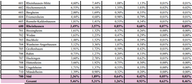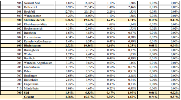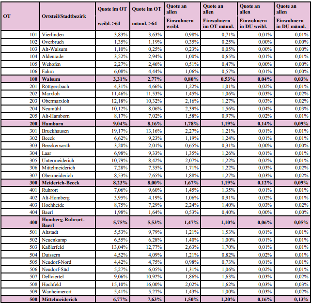 Altersarmut ist in Duisburg sehr ungleich verteilt. Während die Quote von Grundsicherungsleistungsbezieher*innen über 65 Jahren a.v.E. im Verhältnis zu allen Einwohnern ab 65 Jahren in den Stadtteilen im Bezirk Süd im Jahr 2018 größtenteils unter 2% lagen, liegt der Wert in Stadtteilen wie Bruckhausen (16,38 %), Hochfeld (13,31 %), Marxloh (11%) und Kaßlerfeld (10,93%) um ein Vielfaches höher.