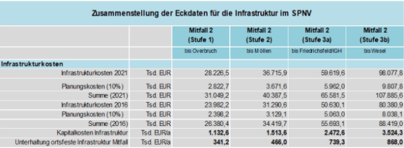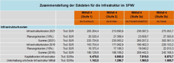 Die Infrastrukturkosten (ohne Planungskosten) betragen für die Betriebsvariante 4 in der geringsten Ausbaustufe (bis DU-Overbruch) rd. 205,2 Mio. €, in der maximalen Ausbaustufe bis Wesel rd. 275,1 Mio. €.