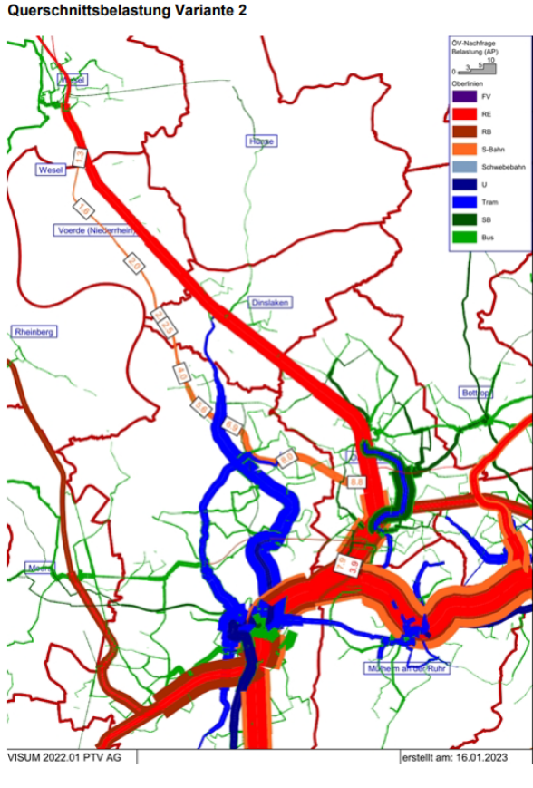 Die größte Verkehrsnachfrage auf der Walsumbahn kann in der Betriebsvariante 2 in der Ausbaustufe 3b erzeugt werden. Hier liegt die durchschnittliche tägliche Querschnittsbelastung im Bereich Wesel/Voerde bei rd. 1600 Fahrgästen und wächst in Richtung Süden auf rd. 8.800 Fahrgäste im Bereich Oberhausen kontinuierlich an.