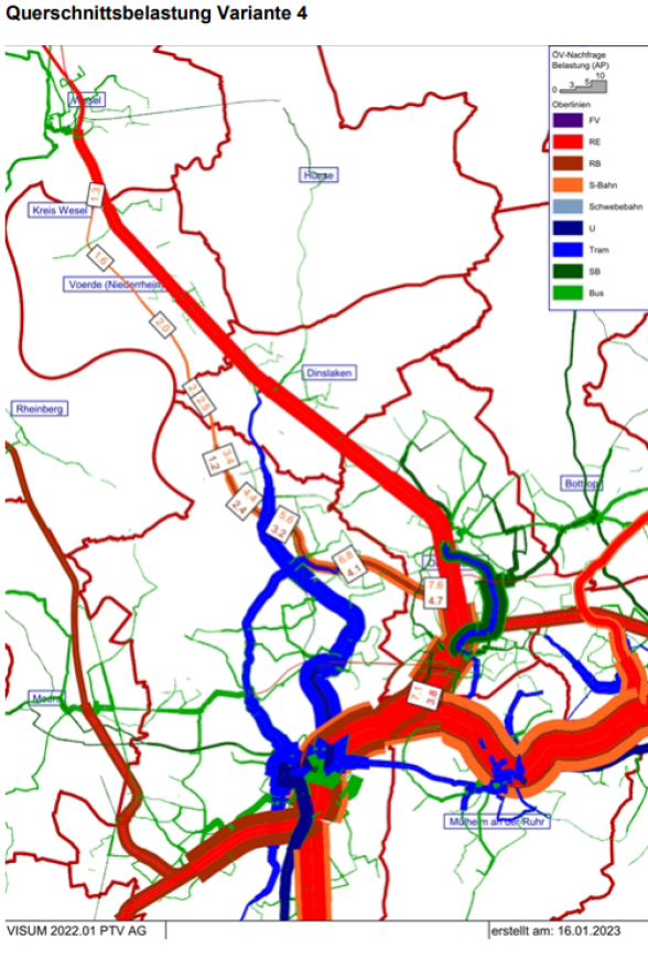 Die größte Verkehrsnachfrage auf der Walsumbahn kann in der Betriebsvariante 4 in der Ausbaustufe 3b erzeugt werden. Hier liegt die durchschnittliche tägliche Querschnittsbelastung im Bereich Wesel/Voerde bei rd. 1600 Fahrgästen und wächst in Richtung Süden auf rd. 12.300 Fahrgäste im Bereich Oberhausen kontinuierlich an.