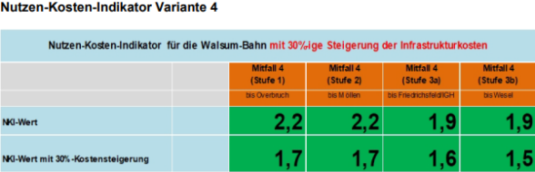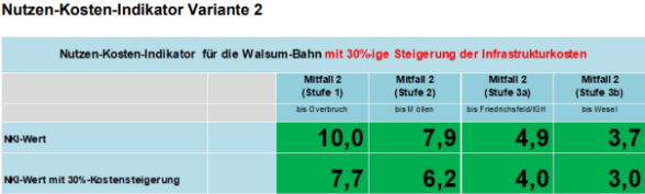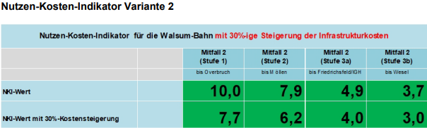 Die Nutzen-Kosten Berechnung kommt für alle Varianten und Ausbaustufen der Walsumbahn zu einem deutlichen positiven Ergebnis. Selbst bei einem unterstellten Risiko einer Kostensteigerung von 30% der Infrastrukturkosten erreichen alle Varianten und Ausbaustufen einen deutlich über 1 liegenden Faktor. Um den größten möglichen Verkehrseffekt bei der Reaktivierung der Walsumbahn zu erzielen wurde im begleitenden Arbeitskreis zur Machbarkeitsstudie, bestehend aus den Vertretern der Anrainerkommunen und dem VRR, der gutachterlichen Empfehlung einstimmig zugestimmt, die Betriebsvariante 4 mit der Ausbaustufe 3b für die weiteren Planungen festzulegen.