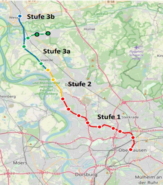 Ausbau-Stufen: Für beide Betriebs-Varianten wurde zudem festgelegt, den Streckenverlauf der Walsumbahn in einzelne Ausbau-Abschnitte zu gliedern, um Aussagen über die Wirtschaftlichkeit der einzelnen Ausbaustufen ableiten zu können.