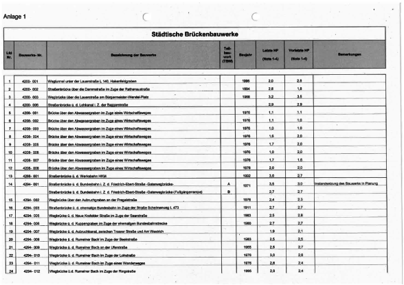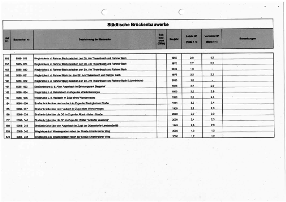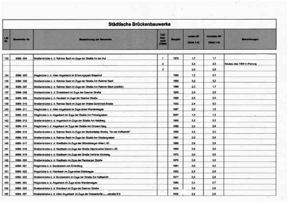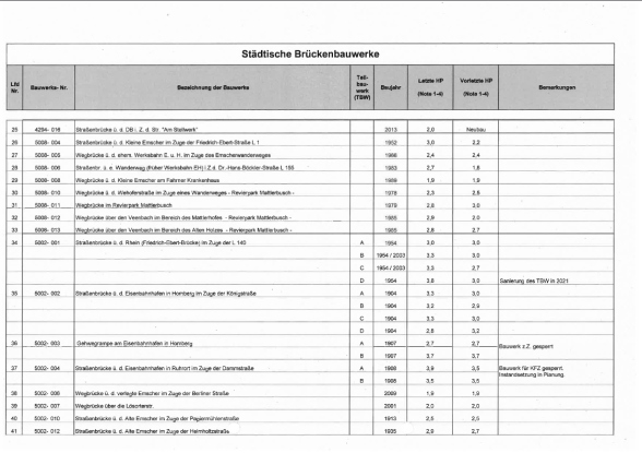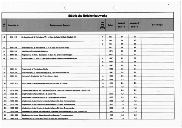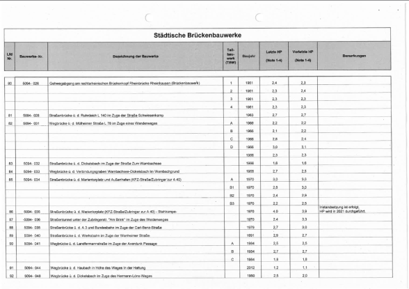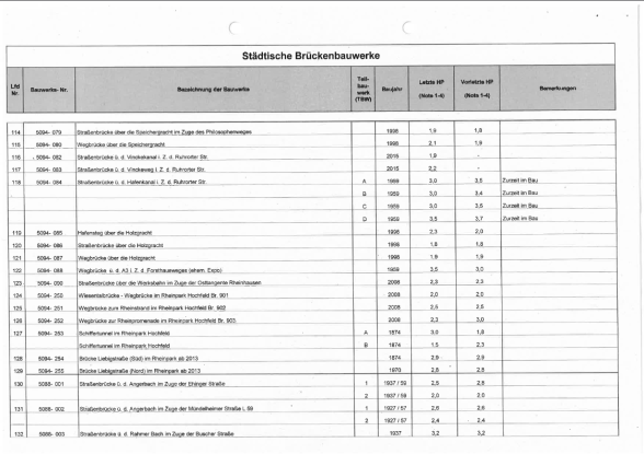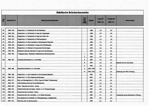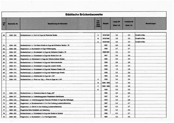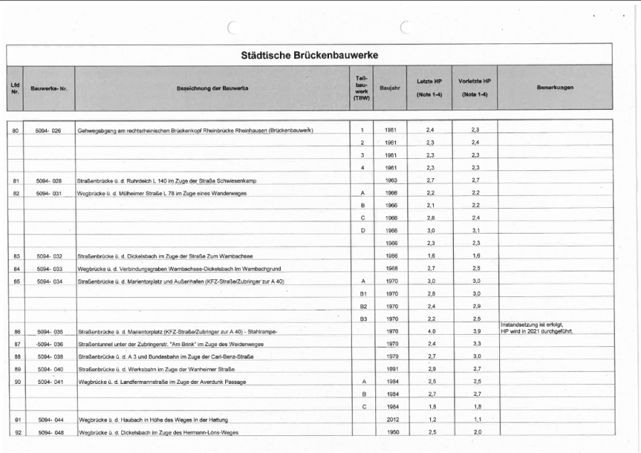 Die Brückenbauwerke der Stadt Duisburg werden alle sechs Jahre durch Ingenieursbüros im Auftrag der Stadt in einer Hauptprüfung geprüft. Es werden sogenannte Schadenskennziffern für alle Brücken vergeben, um einen Überblick über den jeweiligen Zustand zu erhalten.