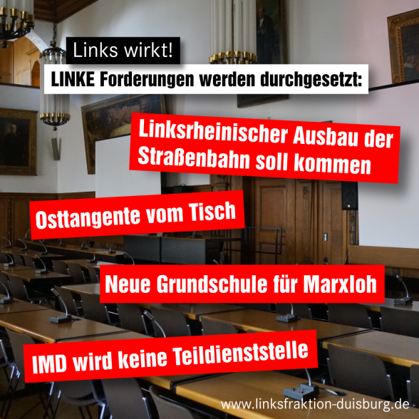 Nachdem DIE LINKE ebenso wie der Personalrat vehement aber leider erfolglos gegen die Einrichtung einer Teildienststelle für das IMD gekämpft haben, gab es in dieser Ratssitzung gute Nachrichten. Die Verwaltung musste einsehen, dass die Einrichtung einer Teildienststelle für das IMD nicht der richtige Weg ist und hat gemeinsam mit dem Personalrat eine Neuausrichtung auf den Weg gebracht. Die Teildienststelle ist jetzt gestorben und somit auch eine potentielle Privatisierung gebannt. Über die Einrichtung verschiedener Sondervermögen soll mit Hilfe der städtischen Tochterunternehmen das Immobilienmanagement in Duisburg deutlich verbessert werden. DIE LINKE hat dem Vorschlag zugestimmt, da er die Möglichkeit bietet, dass die unhaltbare Situation für die Bürgerinnen und Bürger sich verbessert und gleichzeitig das IMD-Personal bestmöglich geschützt und versorgt ist. Ob der Weg ein sicherer Erfolg wird ist noch unklar aber es ist mit Sicherheit ein Schritt in die richtige Richtung.